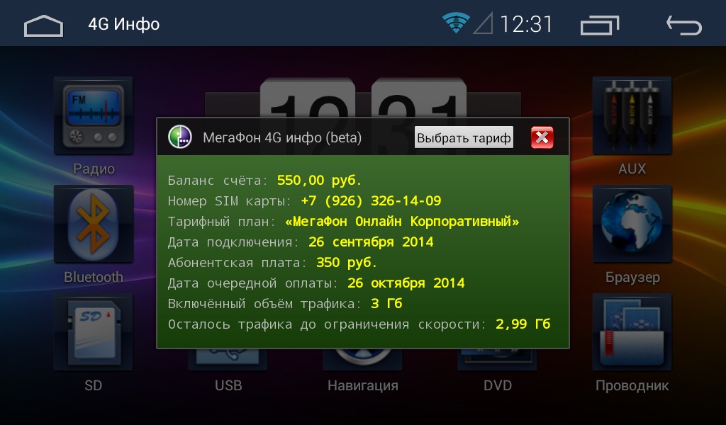 Кроме того, устройство всегда будет держать вас в курсе о балансе и состоянии вашего абонентского номера: специальная утилита вызывается простым нажатием на логотип мегафона (в верхней «шторке» меню).