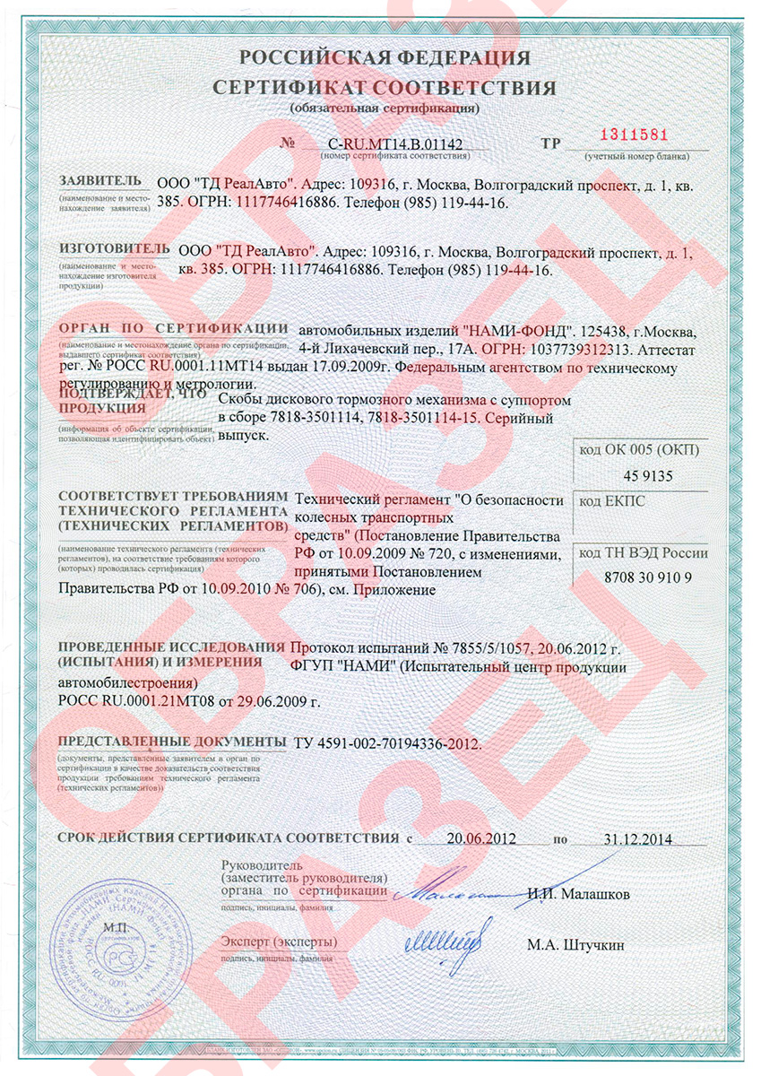 Перечень совместимых тормозных колодок: