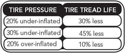 Простое соотношение между жизнью протектора и давлением в шинах наглядно видно в таблице: