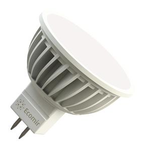 Светодиодная лампа Ecomir GU5.3 4W эквивалентна галогеновой лампе мощностью 30 Вт с цоколем MR16. Потребляемая мощность – всего 4 Вт, цветовая температура – 3000 К (это желтый свет). Световой поток — 300 лм. Напряжение — 220 В. Матовый рассеиватель. Угол освещения > 90°.