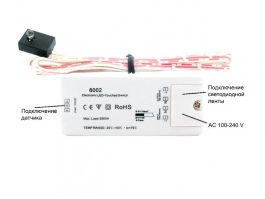 Контактный выключатель 8002 поможет вам без труда включить или выключить диммер. Вам всего лишь нужно дотронуться до сенсорного индикатора  — и диммер заработает! В комплект входит датчик и блок включения.