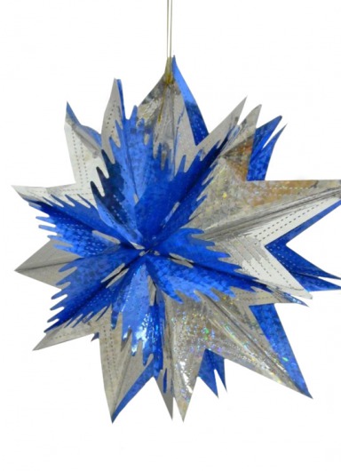 Голографическая сине-серебряная звезда из фольги — прекрасный вариант эффектного и недорогого новогоднего украшения. Новогодняя звезда диаметром 60 см отлично подойдет для украшения уличных елок и просторных помещений. Такая звездочка смотрится очень нарядно, особенно при искусственном свете. А кроме того, она прочная и хорошо хранится, и поэтому будет радовать вас еще много лет.