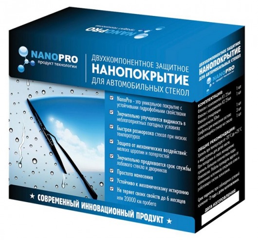 Инновационная российская разработка – нанопокрытие для автомобильных стёкол NanoPro избавит вас от неэффективного мытья стёкол с помощью дворников и стеклоочистителей! Покрытие, состоящее из двух эмульсий, защитит стёкла от всех видов загрязнений – разводов от дождя и снега, прилипшей грязи, насекомых и масляных пятен. Кроме того, нанопокрытие защищает и от механических повреждений – инновационная формула не даёт стеклу покрываться микротрещинами и царапинами.