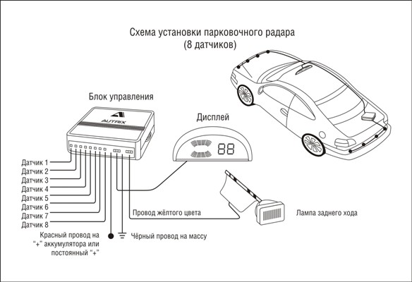 Схема установки парковочного радара AUTRIX E-800.