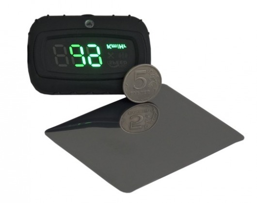 HUD – проектор подключается к бортовой сети автомобиля. Представляет собой светодиодный дисплей (пленка), который располагается на лобовом стекле, а сам проектор ставится на приборную панель. Если вы превысите заданную вами скорость (до 5 сохраняемых настроек), проектор моментально сообщит вам об этом звуком и световым сигналом. При этом настройки можно регулировать, а звук вовсе отключить. Также вы можете самостоятельно регулировать уровни предупреждения и яркость экрана (в зависимости от внешнего освещения).
