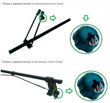 Ручка "Барашек" с замком предназначена для защиты от кражи багажников эконом класса. Заменяет стандартные фиксаторы на велокреплениях Amos, багажниках Amos Tramp (вместо стандартных барашков для стяжки тросов).
