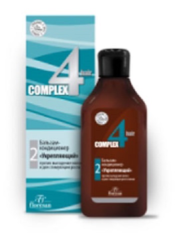 Complex4hair — укрепляющий бальзам-кондиционер против выпадения волос и для стимуляции роста новых. Содержит экстракты лопуха, шишек хмеля, крапивы и перца, d-пантенол и витамины Е, F, которые обеспечивают полноценное питание волос и волосяных луковиц, а также стимулируют рост волос. Биоактивный комплекс "Укрепляющий" насыщает волосы и кожу головы влагой и ценными микроэлементами, делает волосы крепкими и эластичными.