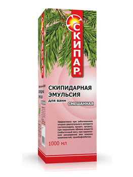 Скипидарная эмульсия "Смешанная" Скипар рекомендуется лицам с нормальным артериальным давлением. Благодаря сочетанию белой эмульсии и желтого раствора обладает более широким спектром действия. Смешанные ванны улучшают капиллярное кровообращение, нормализуют водно-солевой обмен, способствуют рассасыванию кровоизлияний, спаек и рубцов, мало изменяют артериальное давление крови.
