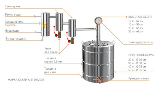 Это устройство подходит для домашнего использования. Работа с ним не требует дополнительных навыков или сложного обучения. Достаточно залить брагу и поставить аппарат на плиту.