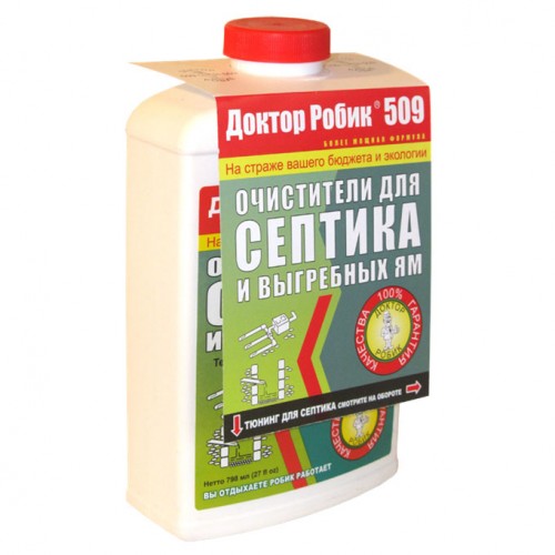 Доктор Робик 509 разработан для разжижения густых масс, окаменелостей, очистки пор в земле. В течение короткого времени восстанавливает нормальную работу канализационных и дренажных систем. Доктор Робик 509 предназначен для очистки проблемных участков септиков, ям, дренажей. Рекомендуется применять после откачки и промывки из расчёта один флакон (798 мл.) на 2000 литров.