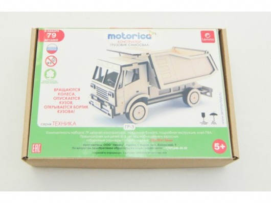 Детали конструктора Lemmo легко и в то же время интересно собираются в красивую и реалистичную игрушку-грузовик. При этом в набор входит клей ПВХ и наждачная бумага, с помощью которых ваш ребенок может собрать развивающий конструктор наиболее аккуратно. После сборки деревянного самосвала можно раскрасить его гуашевыми и акриловыми красками. В результате у вас дома появляется полноценная и красочная деревянная игрушка, у которой к тому же есть подвижные элементы (вращаются колеса). А это не может не обрадовать ценителей качественных и экологически чистых игрушек.