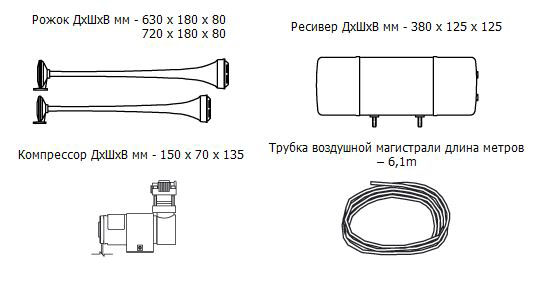Комплект KIT 2009 это ярковыраженный бас на службе Вашего автомобиля. Вы можете разместить устройство под капотом или снаружи автомобиля на свое усмотрение. Основные запчасти можно расположить в разных частях машины: рожок, конечно же, ставится в передней части машины, а вот ресивер и компрессор — в багажнике либо салоне (если нет места в моторном отсеке).