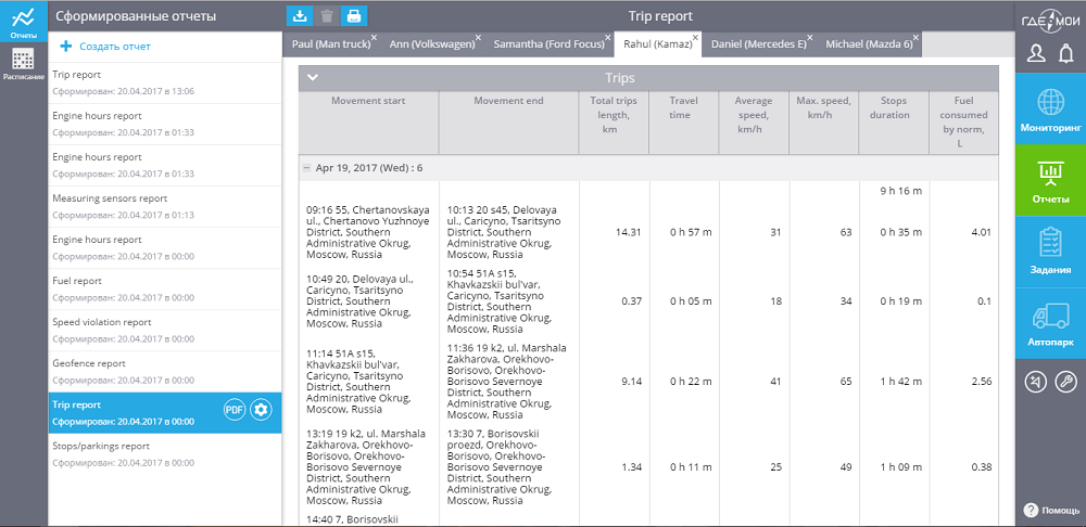В отчетах будут представлены все подробные данные о расходе топлива, дальности пути, времени поездки, скорости, общем времени стоянок и прочее. Такая информация дает почву для анализа выбранных маршрутов, позволит найти новые точки роста производительности и экономии.